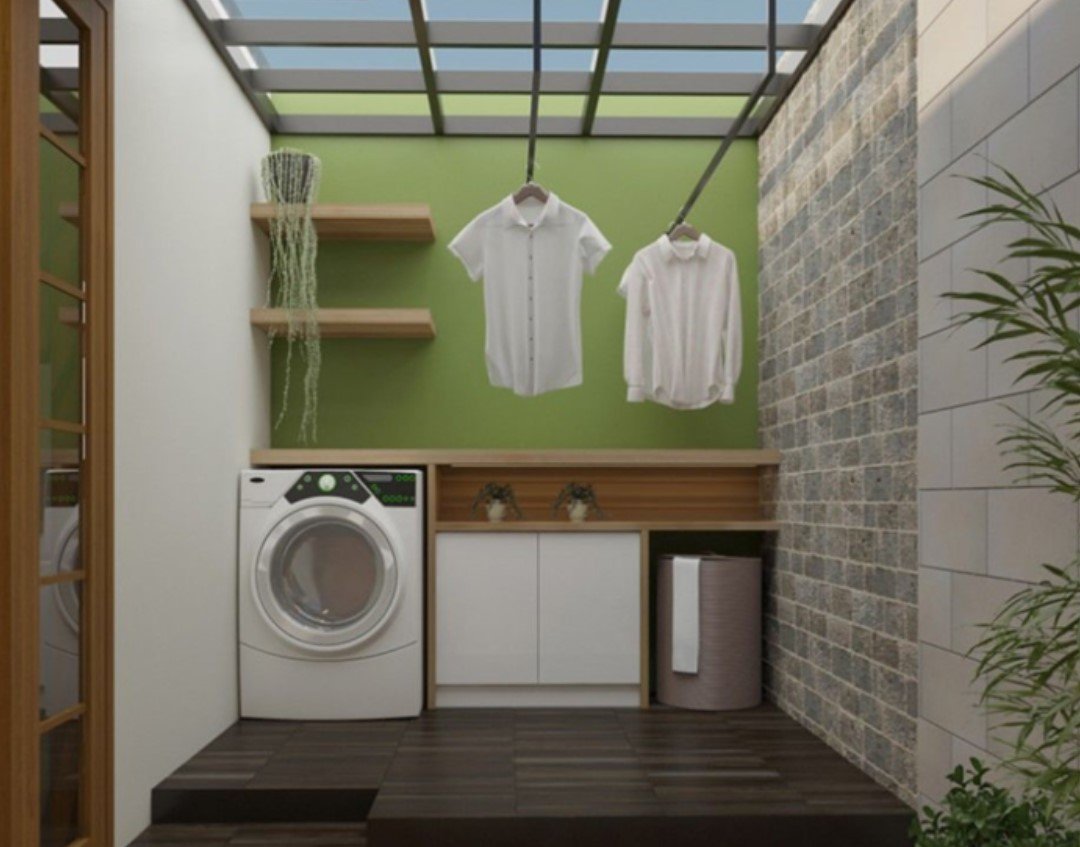 Area tempat cuci ini bisa menggunakan atap terbuka atau transparan yang tembus pandang untuk memaksimalkan pengeringan pakaian. Jadi, Anda tinggal tambahkan saja jemuran tempel berwarna putih dengan ukuran sesuai kebutuhan mencuci harian.