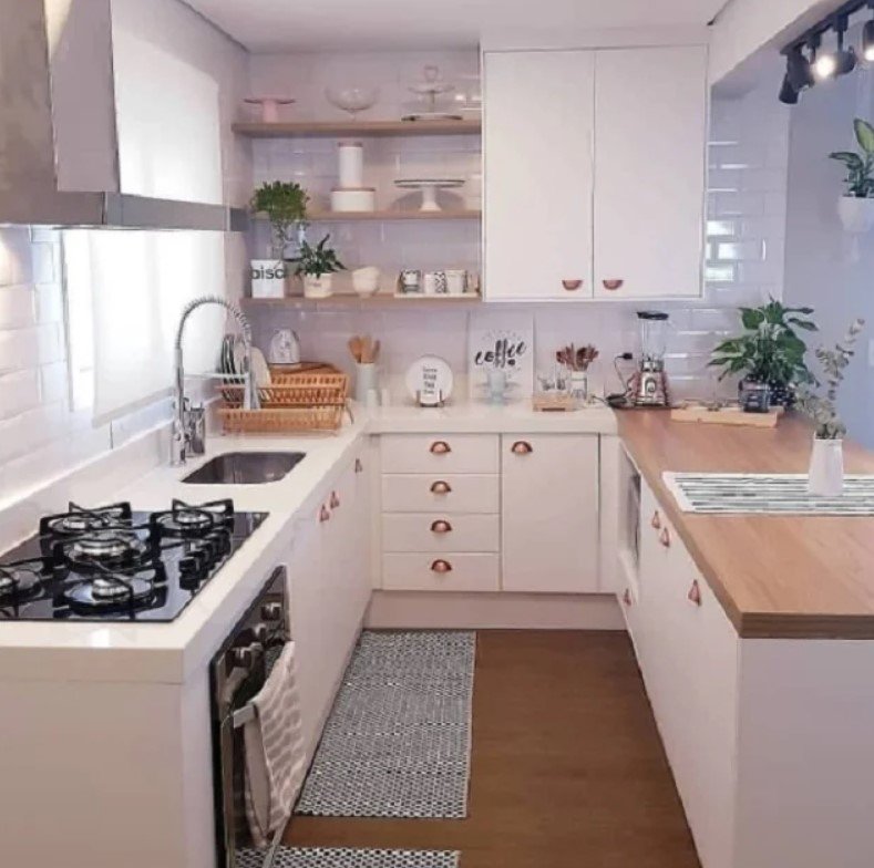 Model dapur ini memungkinkan Anda untuk memiliki lebih banyak ruang penyimpanan. Hal itu dikarenakan tata letaknya menghadirkan banyak ruang di meja dapur untuk menaruh peralatan memasak atau barang lainnya. Anda pun dapat meletakkan lemari kabinet yang menempel di dinding untuk dijadikan ruang penyimpanan tambahan.